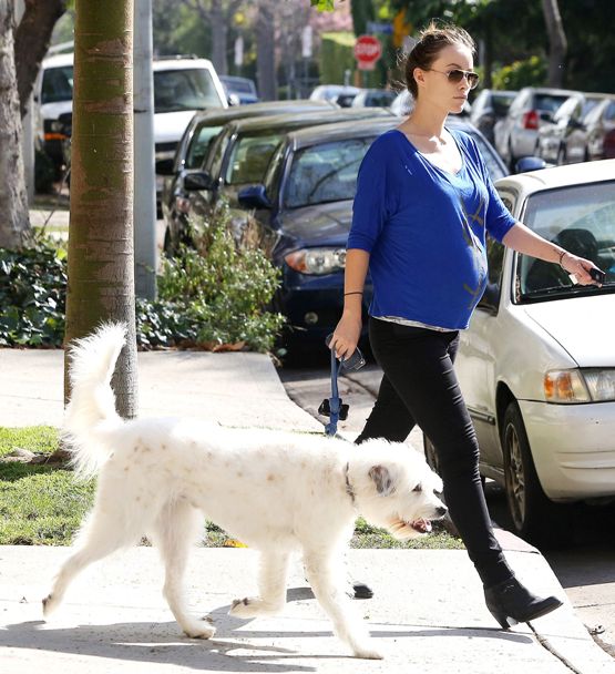 На днях знаменитость прогулялась со своим домашним любимцем по улицам Лос-Анджелеса. Облачившись в просторный синий джемпер YSL и облегающие лосины. На лице актрисы была написана трогательная гордость за свое будущее материнство.