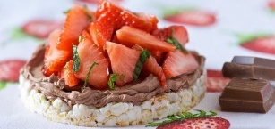 Хлебцы рисовые, сгущенное молоко, черный шоколад, клубника, лимонный сок, мята.