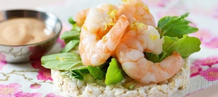Хлебцы рисовые, креветки королевские замороженные, мягкий творожный сыр, руколла, лимонный сок, цедра лимона.