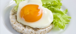 Приготовить яичницу в виде сердца. Для этого либо изначально вбейте яйца в форму в виде сердца, либо уже из готовой вырежьте сердце ножом. Выложите на хрустящие рисовые хлебцы лист салата, ломтик мягкого сыра и яичницу в форме сердца.