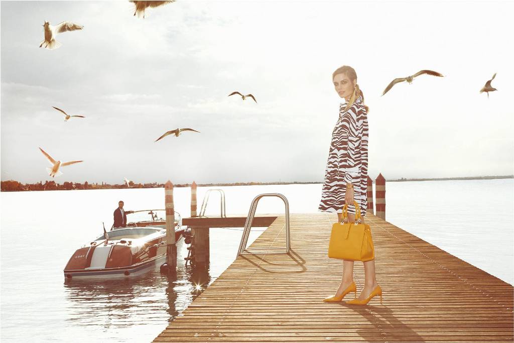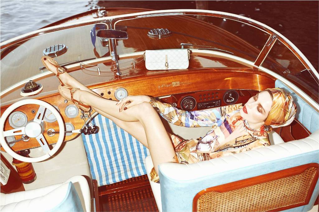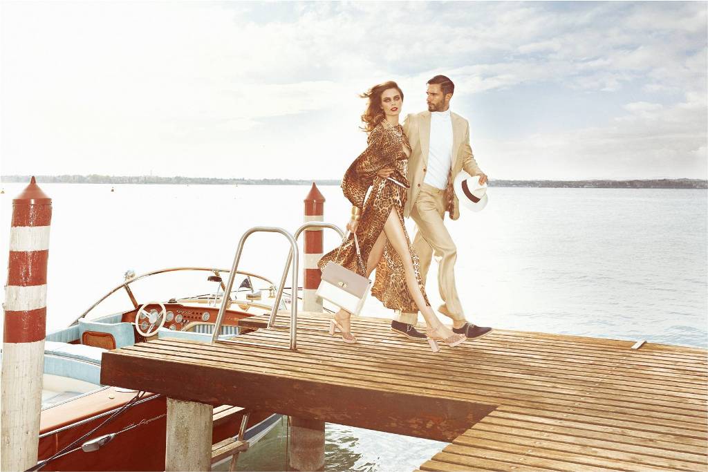 Имиджевые фото подчеркивают тематику коллекции: джетсеттеры 70-х гг и их гардероб обуви. Для свободных духом леди - босоножки на массивных каблуках, лаконичные сандалии с броскими золочеными деталями и, разумеется, классические туфли-лодочки на невысокой шпильке. Для джентльменов – расслабленные мокасины, лоферы и теннисные туфли.