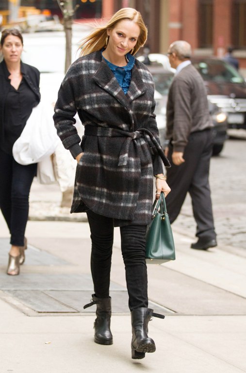В клетчатом пальто и черных брюках была замечена актриса Ума Турман на выходе из отеля The Crosby в Нью-Йорке.