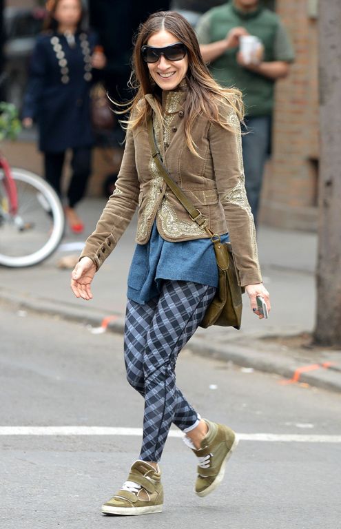 Стильным весенним образом порадовала икона стиля Сара Джессика Паркер. Актриса отправилась в школу за дочками в Нью-Йорке в бежевом жакете и оригинальных джинсах.
