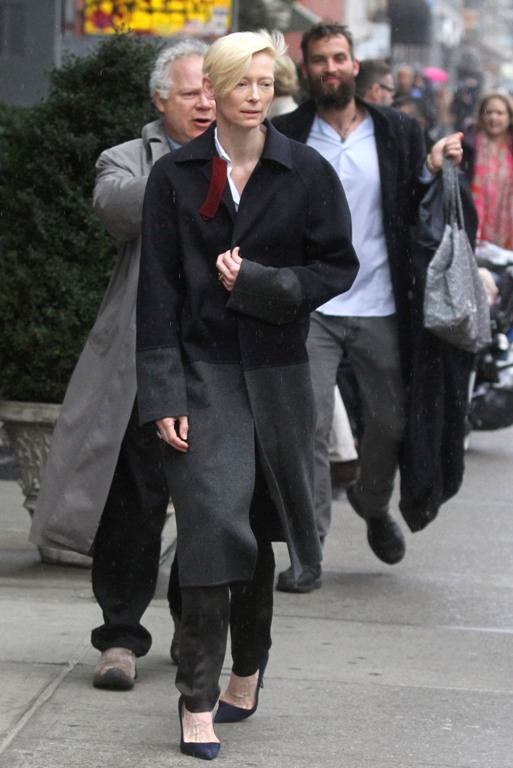 Эпатажная актриса Тильда Суинтон для прогулки по Нью-Йорку выбрала двухцветное серое пальто и классические туфли синего цвета. Получилось лаконично и элегантно.
