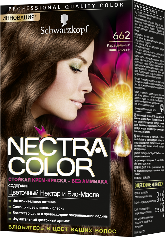 Стойкая крем-краска Nectra Color содержит Цветочный Нектар и Масла. Масла уже давно используются в косметологии, но в красках для волос эта технология стала применяться совсем недавно. Масла действуют как активатор цвета, усиливая действие красителя, что обеспечивает лучшее проникновение цветовых пигментов в структуру волоса. Так достигается стойкий результат окрашивания и полное закрашивание седины, а волосы становятся блестящими и мягкими. И все это без аммиака!