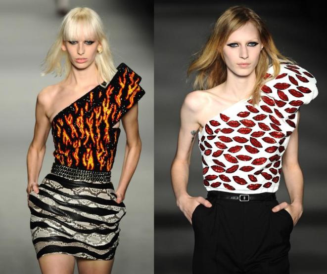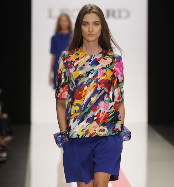 Бренд YSaint Laurent предлагает для весны-лета 2014 асимметричную блузу с ярким эпатажным принтом. Сочетать можно с юбкой в полоску.
