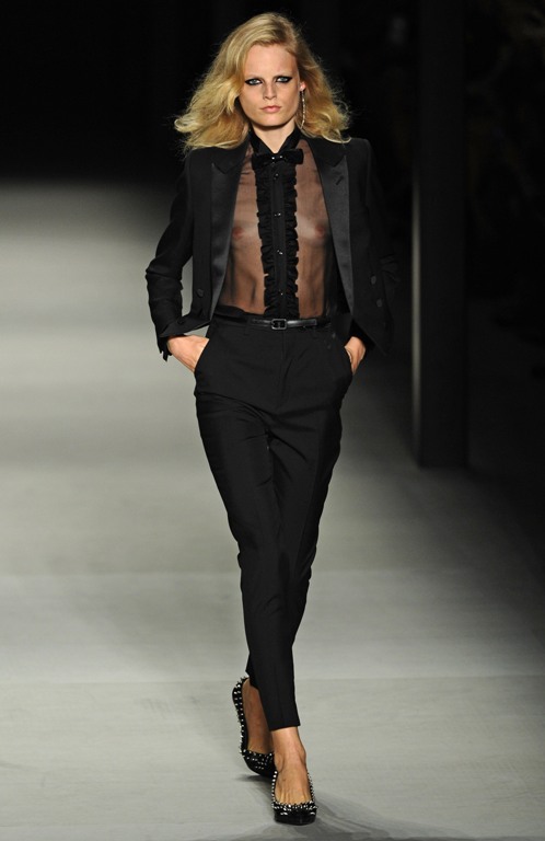 Актуален и прозрачный женственный вариант с жабо и бабочкой от YSaint Laurent. Причем комбинировать такую блузу можно как с жакетом, так и с курткой-косухой.