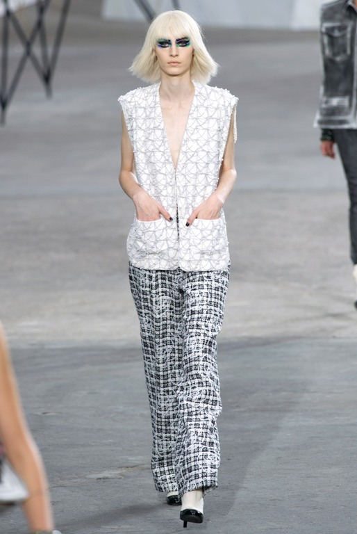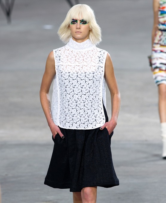 Модный вариант от Chanel – кружевная блуза без рукавов с воротником-стоечкой.