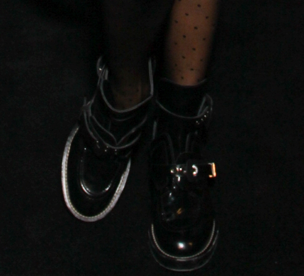 Виктория Боня для Mercedes-Benz Fashion Week Russia выбрала элегантное светлое платье. Знаменитость дополнила свой образ симпатичными черными колготками в горошек и оригинальными ботинками на низком ходу с серебристым декором.