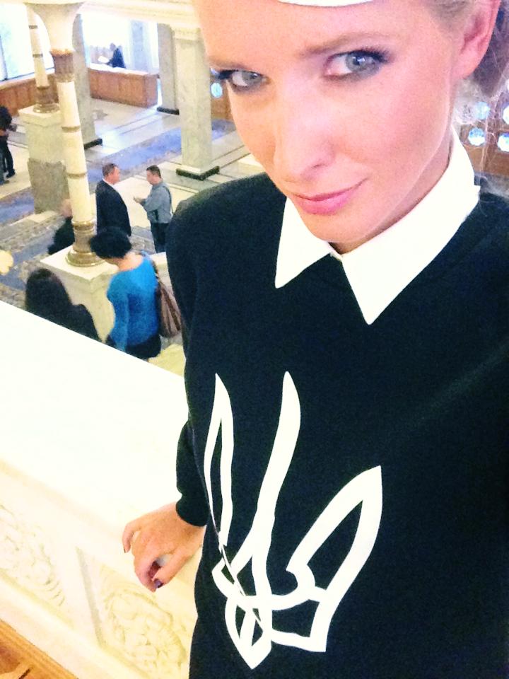 Катя Осадчая обожает патриотичные наряды. Как-то ведущая вышла в свет в черно-белом свитшоте с тризубом.