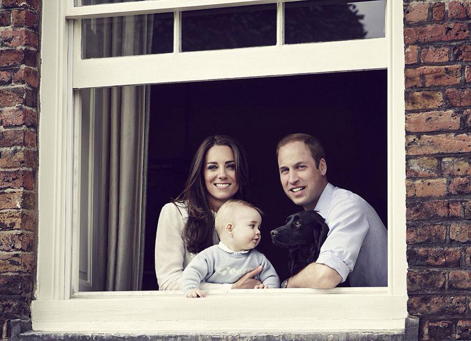 На новом семейном фото запечатлены Кейт, Уильям, малыш Джордж и пес Лупо. Королевская семья позирует у окна одной из комнат Кенсингтонского дворца, где они постоянно проживают.