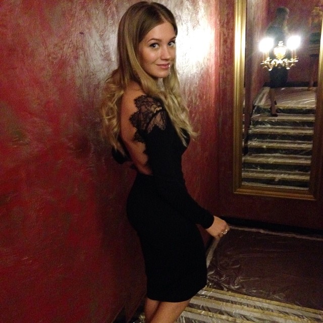 Кристина Асмус в черном вечернем платье с обнаженной спиной и эффектной кружевной вставкой отправилась на съемки программы Сomedyclub в Goldenpalace, предварительно опубликовав фото в своем микроблоге.
