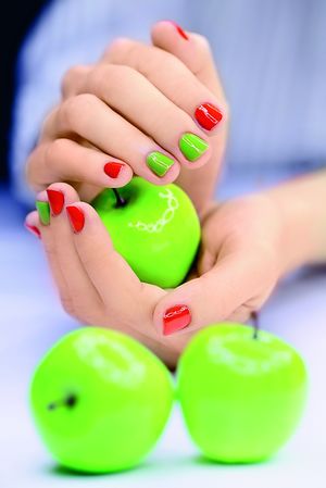 В два цвета. Комбинировать позволено и контрастные тона, и близкие по звучанию. Какие ногти каким цветом красить, значения не имеет. Главное – микс.