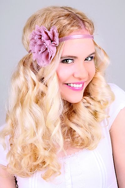 Мило. Завитые на плойку локоны раздели пробором. Повяжи на лоб ленту (как хиппи).