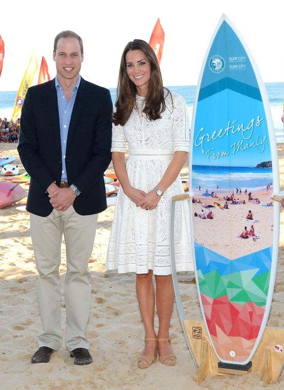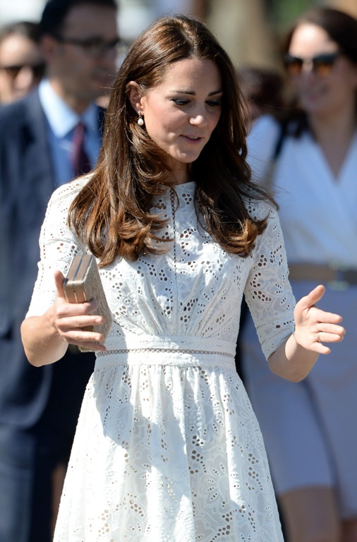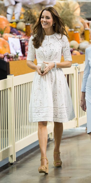Для официальных мероприятий в Сиднее Кейт выбрала белое кружевное платье без нижнего чехла и длиной выше колена.