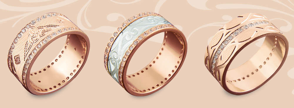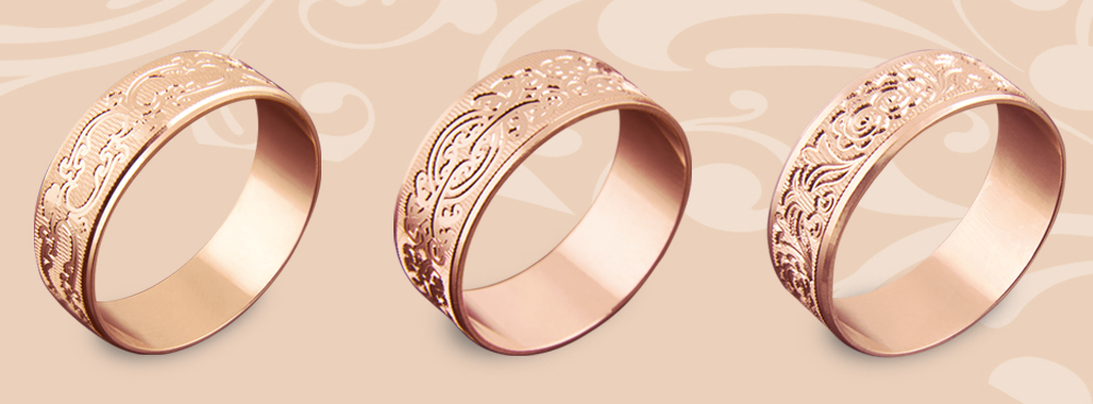 Растительные орнаменты - символы сплетения двух судеб в неразрывную связь. Изысканная вязь из листьев и цветов, тонкие извилистые узоры на обручальных кольцах являются неотъемлемыми элементами романтического образа. Цветы в орнаменте символизируют возрождение жизни, целомудрие и чистоту души.