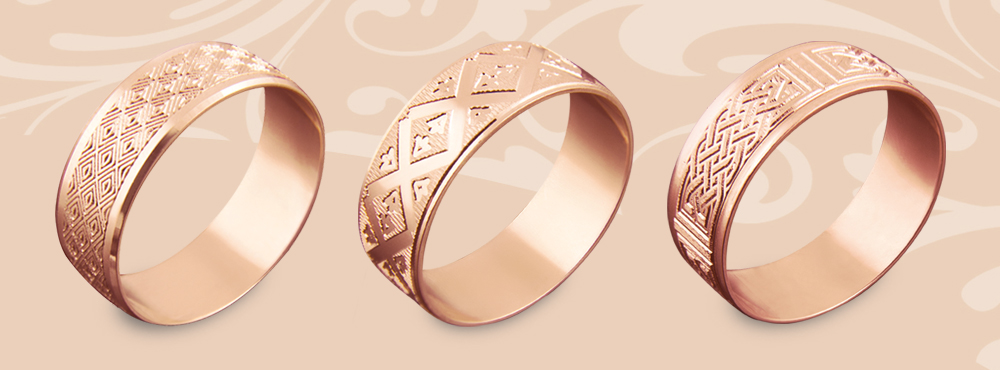 Геометрические орнаменты - гармоничное сочетание ромбов, овалов и линий. Фактурность рисунка раскрывает красоту металла и придает индивидуальные штрихи. Изящное переплетение линий в сочетании с простыми и в тоже время лаконичными фигурами олицетворяют дуальность – единство женского и мужского начала. Стилизованный шахматный орнамент напоминает о то, что противоположности всегда притягивают и дополняют друг друга.