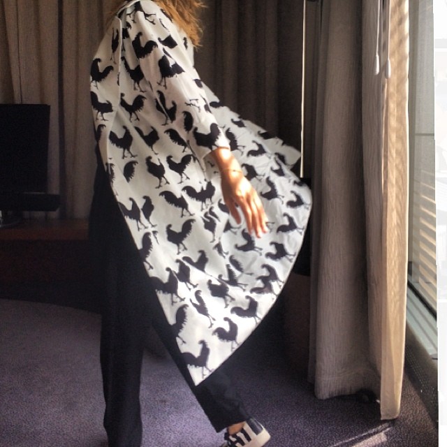 Сейчас Собчак уже в Москве и даже успела примерить обновку – черно-белое пальто в петухах, прокомментировав вещь: «Урра!! Дождалась своих «петухов». Самое красивое пальто этого летнего сезона! :))»