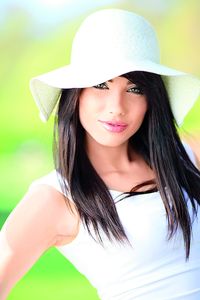 Яркая внешность. Темные волосы, глаза чистого цвета, яркие брови.