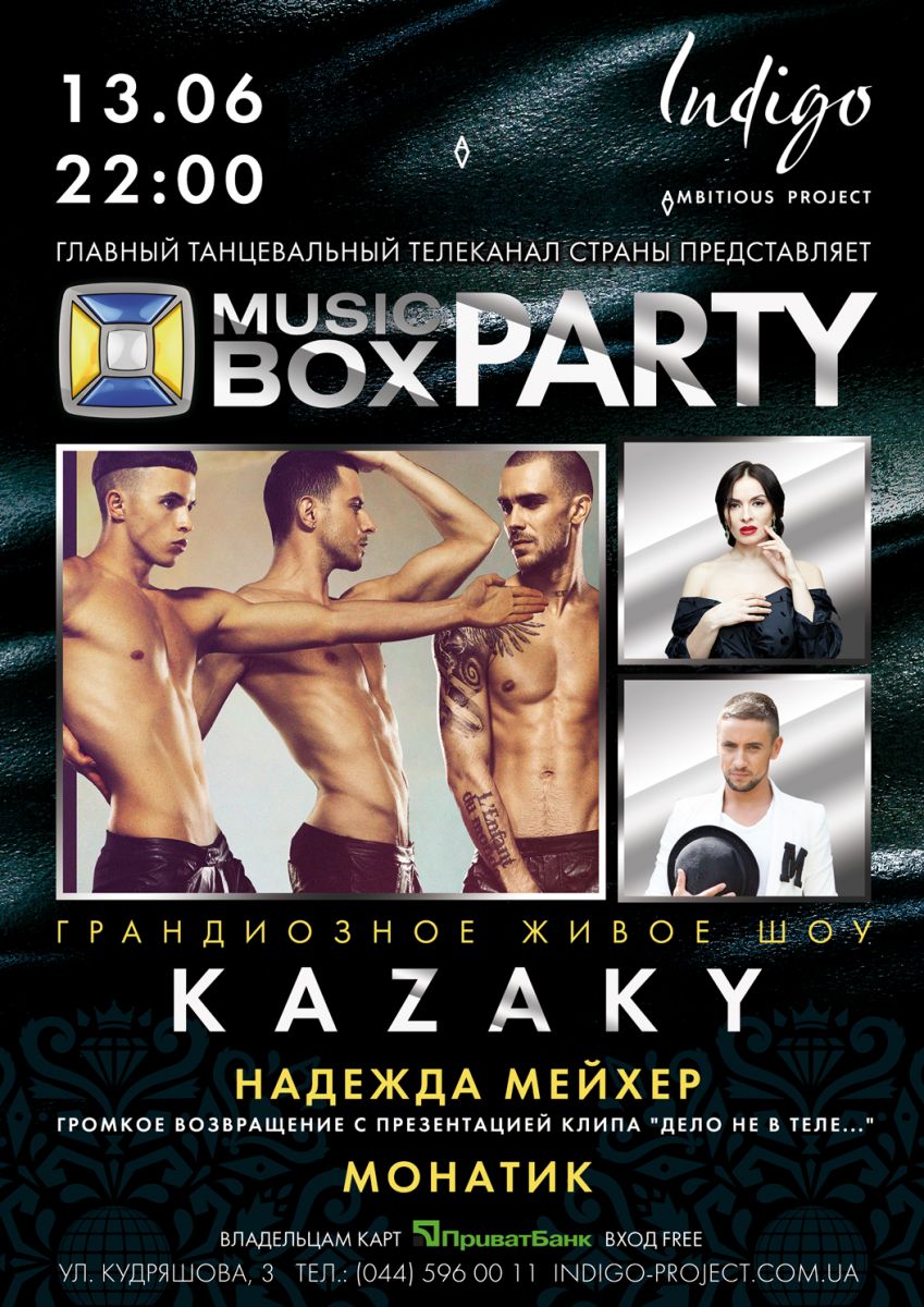 13 июня телеканал «Music Box» в который раз всколыхнет столицу Украины громкой вечеринкой в клубе «Indigo». Первая летняя Music Box Party ошеломляет своим составом участников. На вечеринке свои яркие живые шоу продемонстрируют: эпатажная украинская группа с мировой славой «Kazaky», главная «ВИА Гра» Надежда Мейхер и один из самых стильных исполнителей нового времени Дима Монатик.