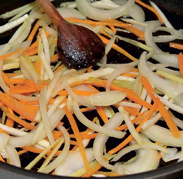 1 Имбирь помой, натри на терке и отожми сок. Лук, морковь и сельдерей очисти и нарежь соломкой. Слегка обжарь в растительном масле, добавь сахар, специи, уксус, имбирный сок и томат. Готовь 2 минуты.