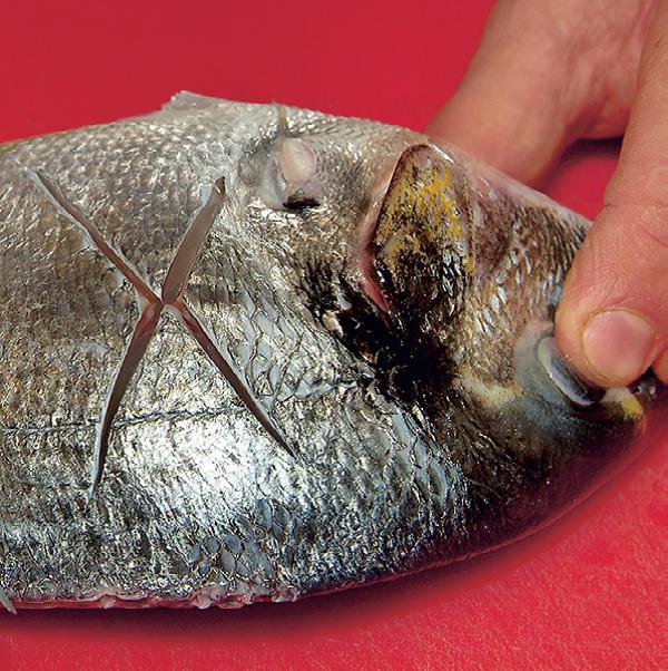 2 Рыбу почисти, промой под проточной водой и просуши бумажным полотенцем. Острым ножом сделай неглубокие крестообразные надрезы на боках. Посоли по вкусу. Добавь в маринад перец горошком.