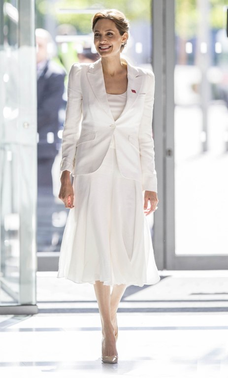 Для официального мероприятия Джоли выбрала полуделовой белый костюм с легкой воздушной юбкой ниже колен. Однако наряд был явно велик Энджи.