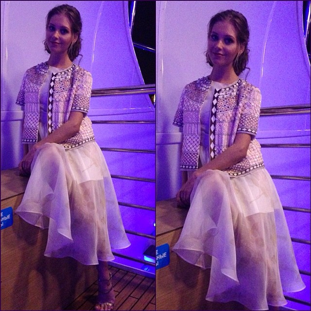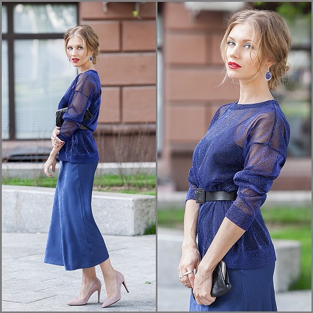 А это летний вечерний образ от бренда ElenDan. Кристина Асмус очень правильно выбрала синий: этот цвет – один из самых модных этим летом. Важная деталь образа – полупрозрачная блуза.