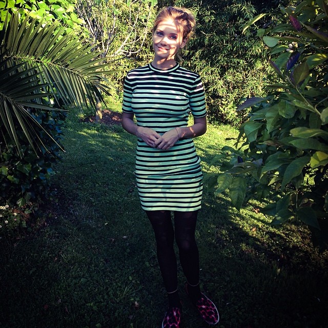 Монохромное полосатое платье-тельняшка – неизменный летний хит. В таком наряде Кристина Асмус гулял по Парижу во время Каннского фестиваля. Обрати внимание на обувь – яркие розовые тапочки придадут изюминку образу.