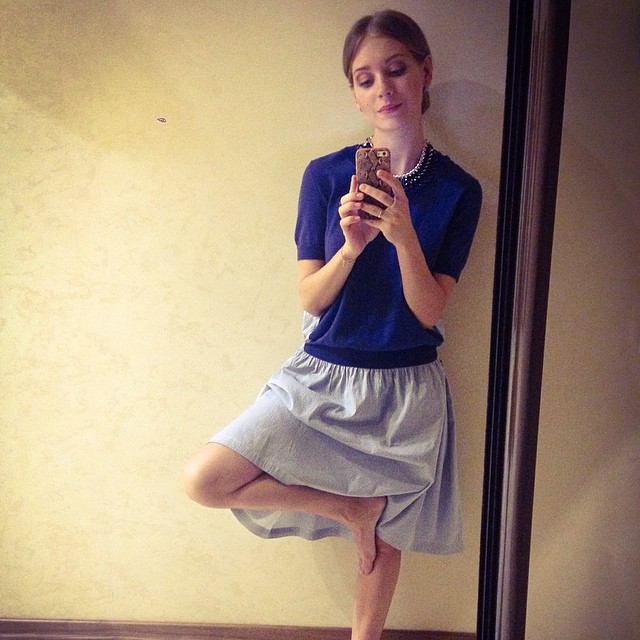 Отличный повседневный образ – платье с трикотажным верхом и легкой льняной юбкой. Кристина дополнила образ массивной цепью-колье. К слову, цепи в разных вариациях летом 2014 также в тренде.