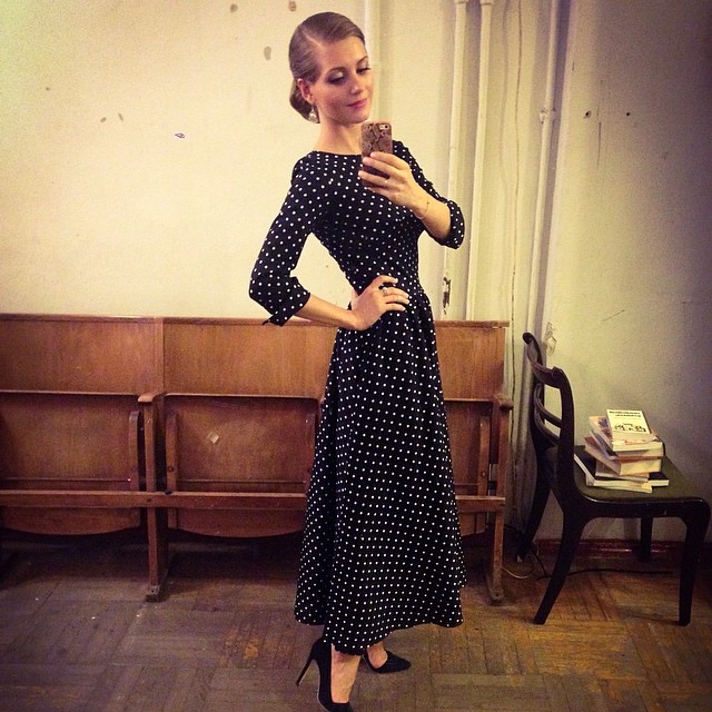 Стоит этим летом обратить свое внимание и на ретро-платья. Ретро-образ от Кристины Асмус – платье в горошек, гладкая прическа и классические туфли, пример стильного вечерне-коктейльного лука.