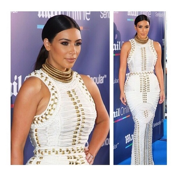 Свой образ Ким Кардашян дополнила гладкой прической с конским хвостом и «дымчатым» бронзовым макияжем.