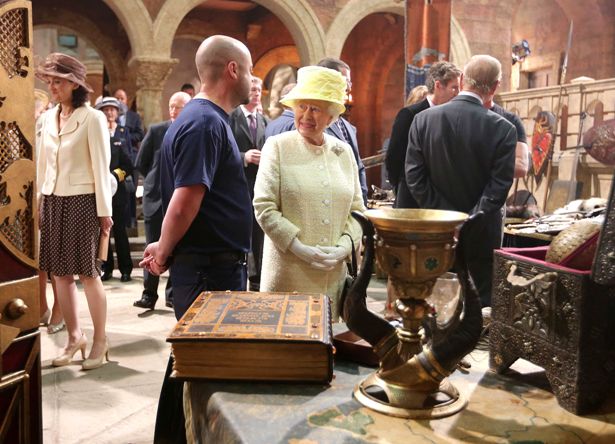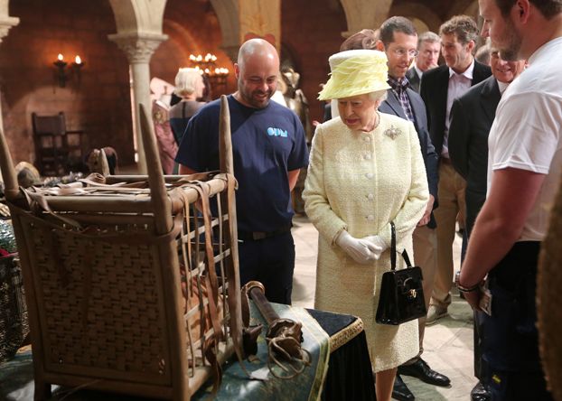 Королева Елизавета получила возможность осмотреть символ сериала – Железный трон, выплавленный из мечей, ради которого и происходят все события в «Игре престолов». Королеве предложили присесть на знаменитый трон, но Елизавета вежливо отказалась, но с удовольствием осмотрела и потрогала легендарный реквизит.