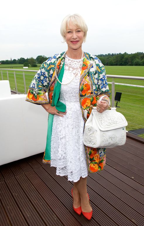 Актриса Хлене Миррен на Audi Polo Challenge была в белом кружевном платье. А чтобы образ не был скучным, Хелен надела цветастое летнее пальто и коралловые туфли.