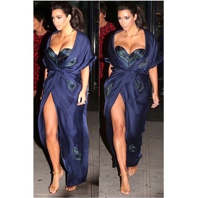 В этот раз Ульяна Сергеенко одела Ким Каррдашян в синее шелковое платье с глубоким декольте и высоким разрезом до бедра. «Last nights look - one of my new favorite designers Ulyana Sergeenko», – подписала фото Ким, назвав Ульяну Сергеенко своим новым любимым дизайнером.
