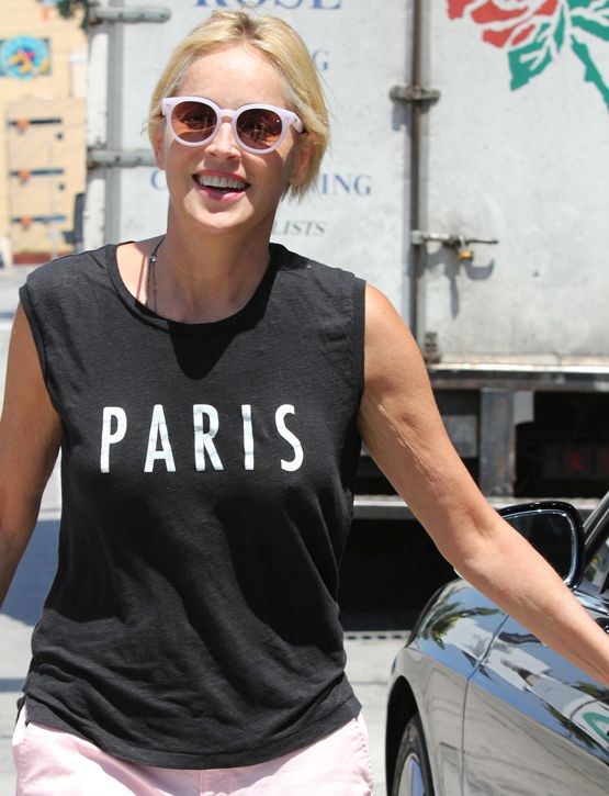 Для прогулки Шэрон выбрала светло-розовые брюки и черную футболку без рукавов.