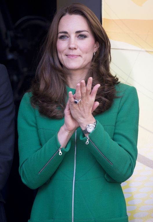 В таком наряде Кейт побывала на открытии Tour de France в Йоркшире, Великобритания, в компании мужа и его брата принца Гарри. Поскольку дресс-код мероприятия не предполагал вечернего платья, Кейт Миддлтон выбрала довольно простое платье-пальто бутылочного оттенка на длинной молнии.