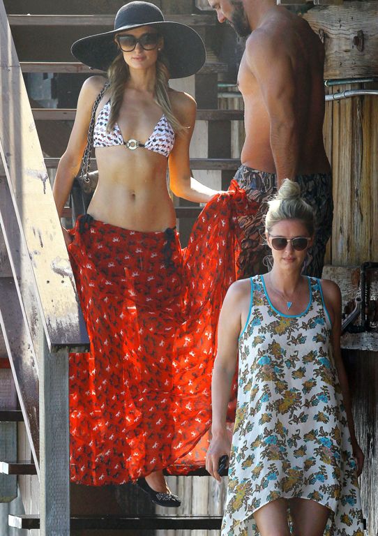 Также не забыла Пэрис о стильных солнцезащитных очках и широкополой шляпе.