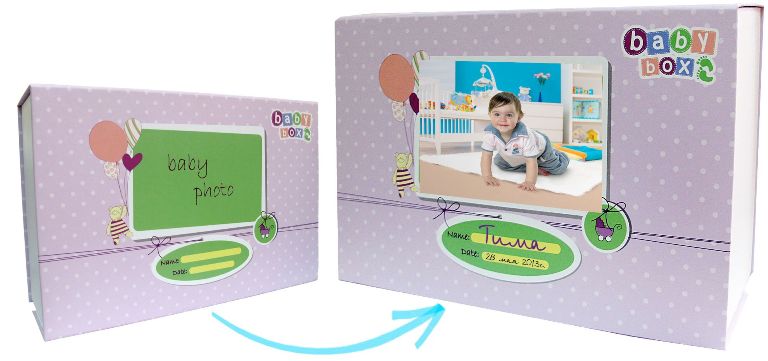 Коробочка имеет оригинальный дизайн: есть место для фото малыша и подписи. Вы можете хранить в коробочке милые сердцу вещички, связанные с Вашей крохой.