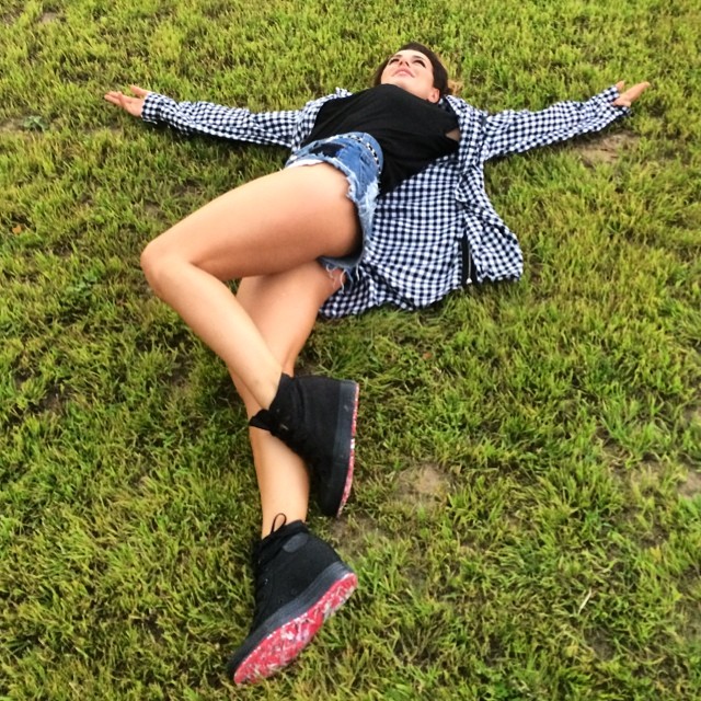 Снимок сделан во время отдыха на природе, девушка принарядилась в шортики, футболку и рубашку собственной марки – LaStory.
