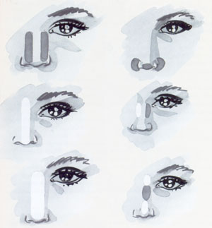 · Даже при искривленной носовой перегородке можно обойтись без пластической операции. Нанеси на весь нос небольшое количество темного тонального крема или пудры, чтобы он не привлекал к себе внимания, а потом сделай акцент при помощи макияжа на глаза.