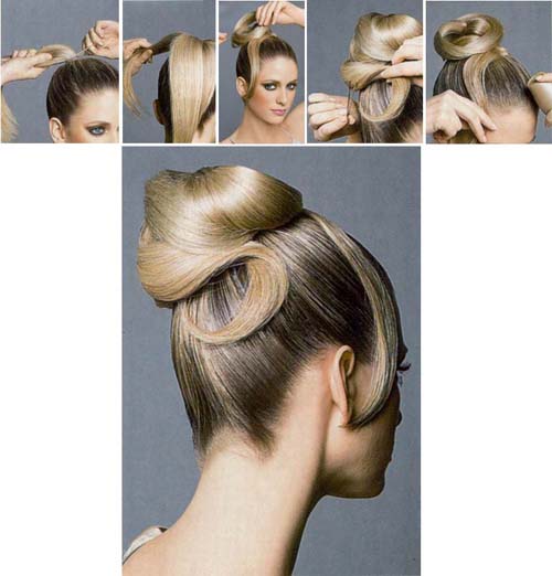 - Раздели пучок на пряди разной толщины: тонкая, толстая, средняя. Каждую из прядей вытяни с помощью утюжка, не забыв нанести средство для укладки. Тонкую прядь оберни вокруг основания пучка и зафиксируй. Среднюю прядь оберни вокруг основания пучка один раз - сформируй локон и перемести его вперед.