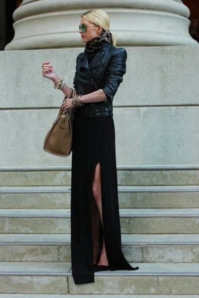 Куртка косуха прекрасно смотрится с длинными юбками, а особой изюминки образу добавляет высокий разрез.