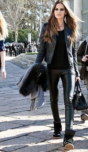 Настоящая девушка рокера: облегающие леггинсы под кожу, черный топ и черная куртка косуха!