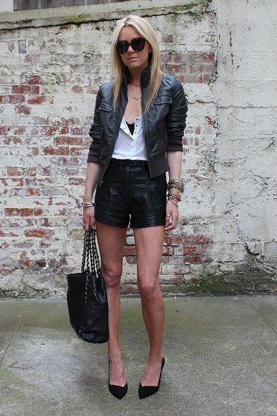 Кожу к коже! Кожаная куртка косуха идеально подходит к кожаным шортам с завышенном талией. Белая рубашка, заправленная в шорты, делает look более женственным.