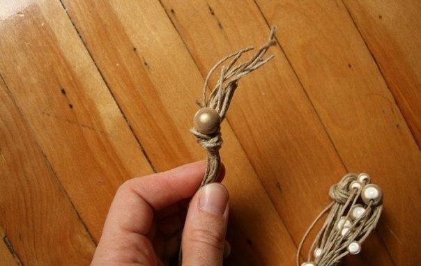 Оставь около 10 см для жемчуга, сделай большой узел из всех нитей.