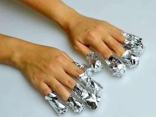 Заранее нарежь фольгу на прямоугольники достаточного размера, чтобы тебе было удобно обернуть всю верхнюю фалангу пальца.