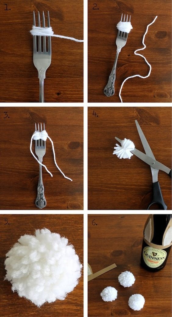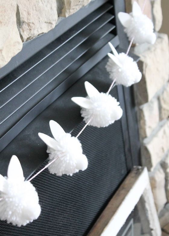 Тебе понадобятся шерстяные нитки белого или серого цвета, вилка и кусочек фетра или просто бумаги. Из ниток делаешь большие помпоны, как показано на рисунке, к нему приклеиваем «хвостик» из меньшего помпона или фетра, вырезаешь ушки и также приклеиваешь к «зайчику». А после нанизываешь гирлянду на нитку.